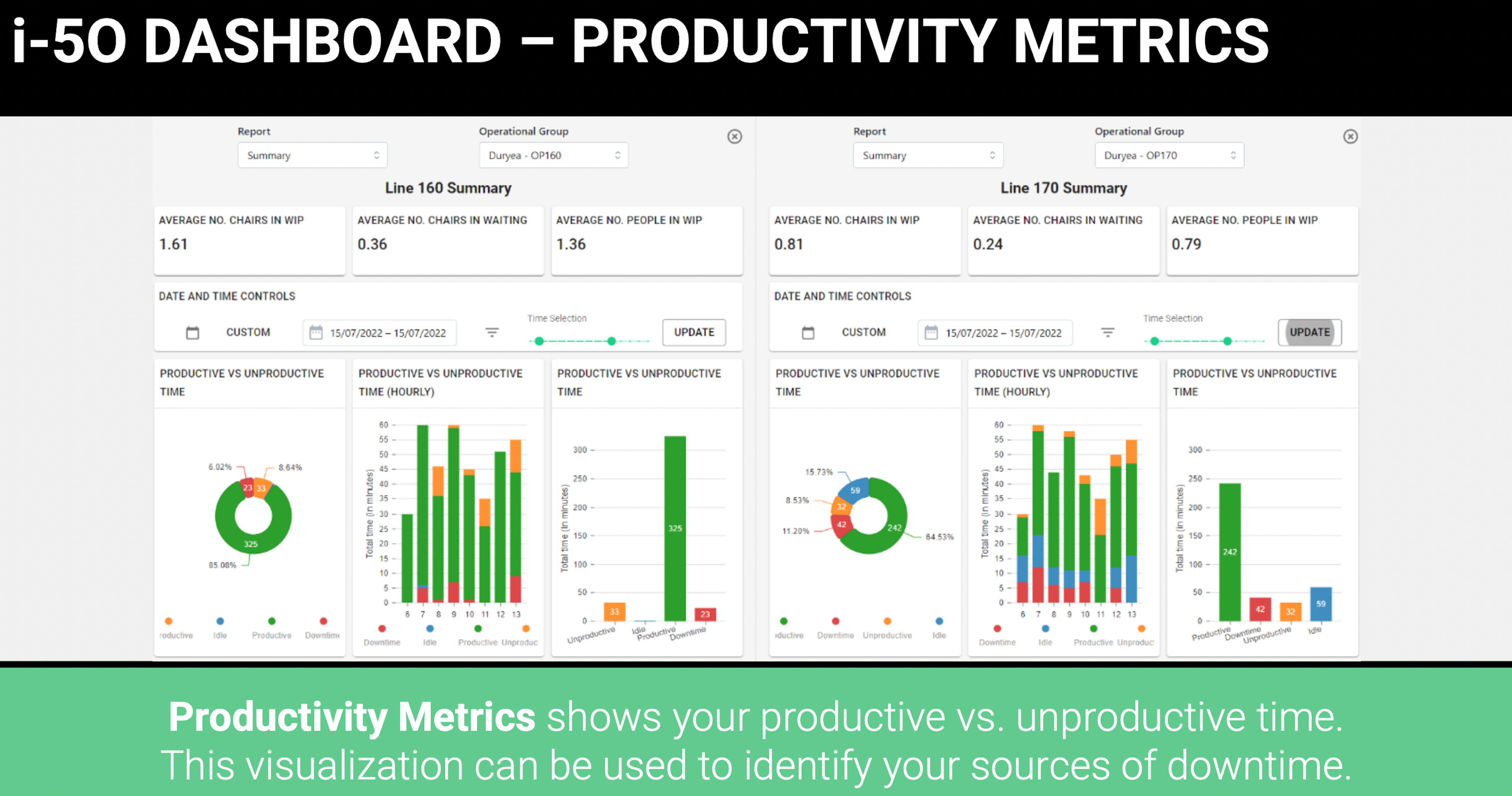i-5O vision allows you to have continuous visibility into efficiency and capacity on the production floor. Employing a value stream map, you will gain a comprehensive overview of your operations, enabling real-time identification of areas needing attention. Amplifying this situational awareness is the Productivity Dashboard, providing granular insights into Overall Labor Efficiency, capacity utilization, and average processing time amongst other key metrics. Not only does this data allow for identification of sources of downtime but can also be used to uncover hidden production capacity and determine whether investment in additional capacity is needed, significantly improving production processes and planning. Through continuous monitoring, your engineering teams can quickly respond to production issues that would otherwise go unnoticed till too late, so that they can continuously meet their target cycle times. Alleviating production bottlenecks and delays will allow you to further improve production capacity and efficiency.